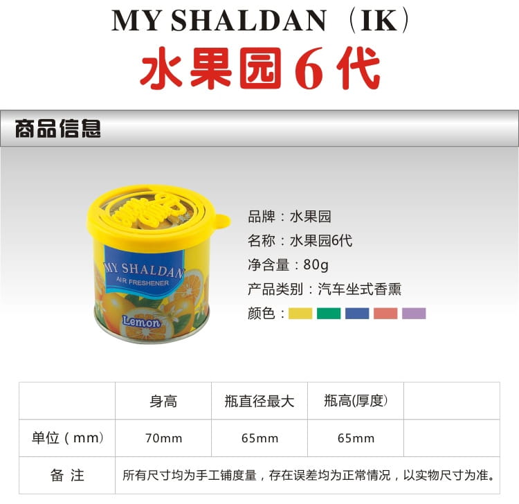 產品特點:水果園6代-汽車香膏清爽的水果香味,是我們最熟悉的香味,也是我們最喜歡的味道,它祛除車內、室內的嗅味、異味,消滅細菌,凈化空氣 營造清新可人的香氛,提神爽氣。